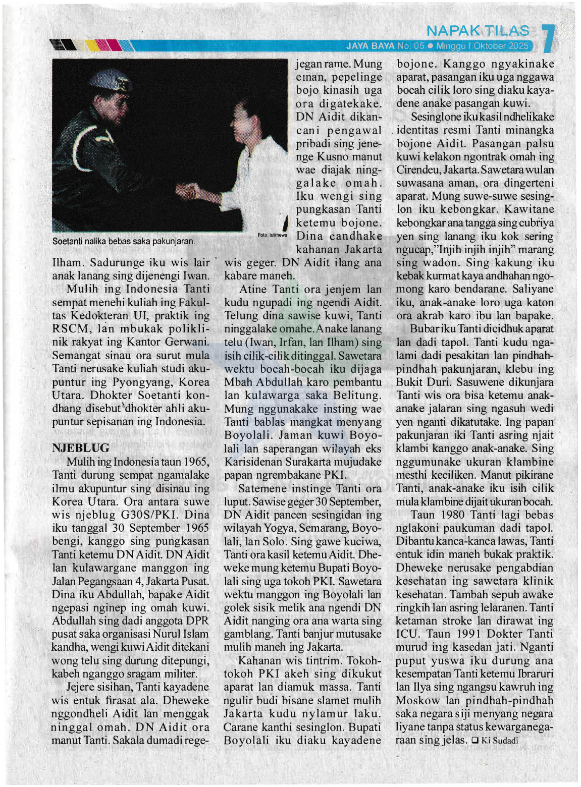 SOETANTI, DHOKTER AKUPUNTUR SEPISANAN Kageret Ulegan Politik Merga Bojone Tokoh PKI
